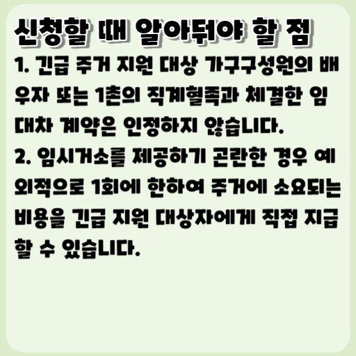 1. 긴급 주거 지원 대상 가구구성원의 배우자 또는 1촌의 직계혈족과 체결한 임대차 계약은 인정하지 않습니다.