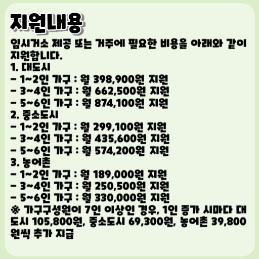 임시거소 제공 또는 거주에 필요한 비용을 아래와 같이 지원합니다.