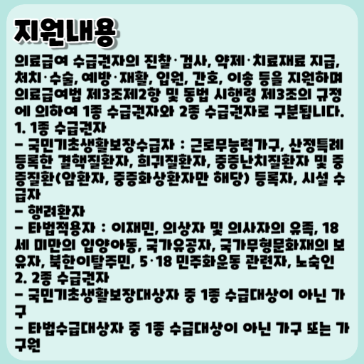 의료급여 수급권자의 진찰・검사, 약제・치료재료 지급, 처치・수술, 예방・재활, 입원, 간호, 이송 등을 지원하며 의료급여법 제3조 제2항 및 같은 법 시행령 제3조의 규정에 의하여 1종 수급권자와 2종 수급권자로 구분됩니다.